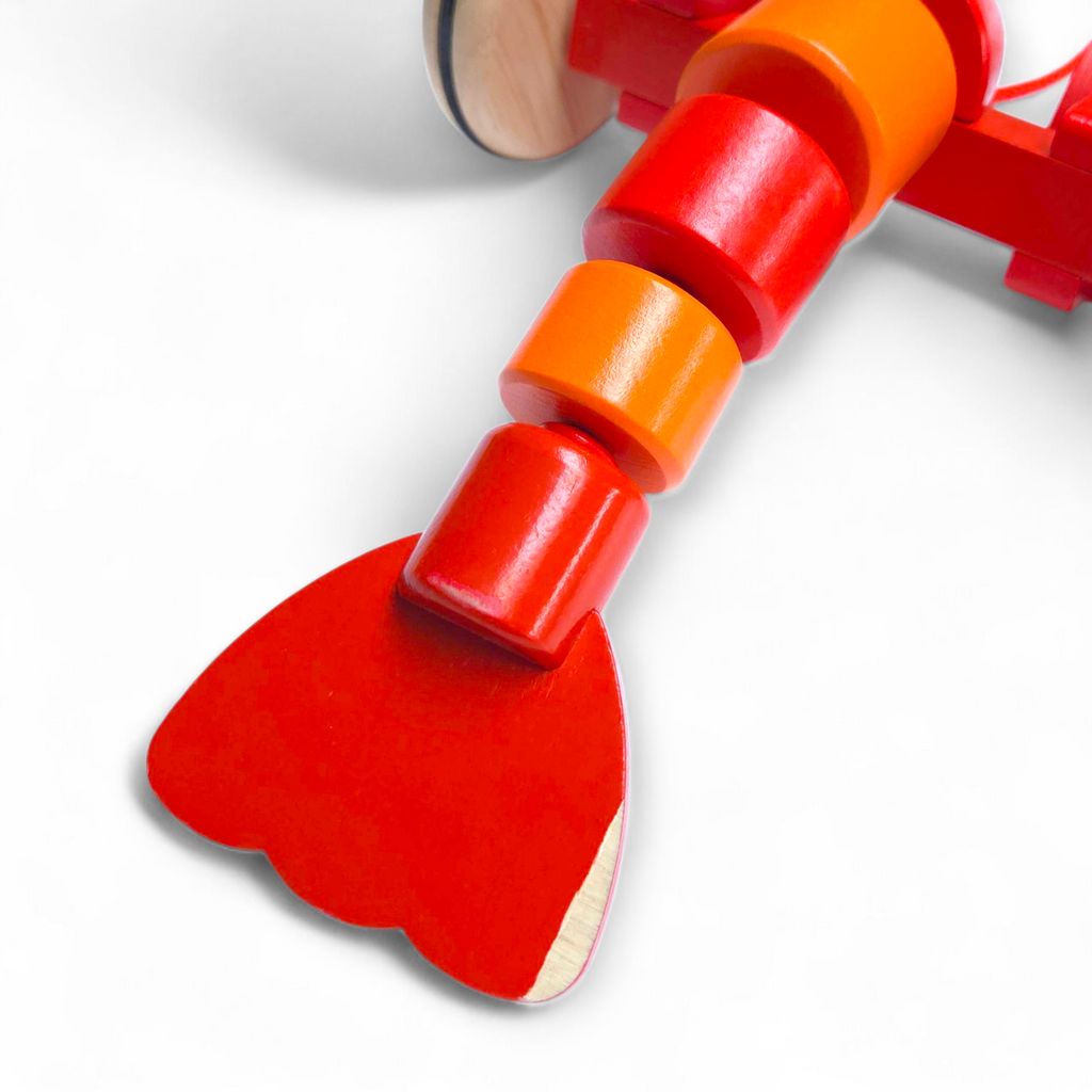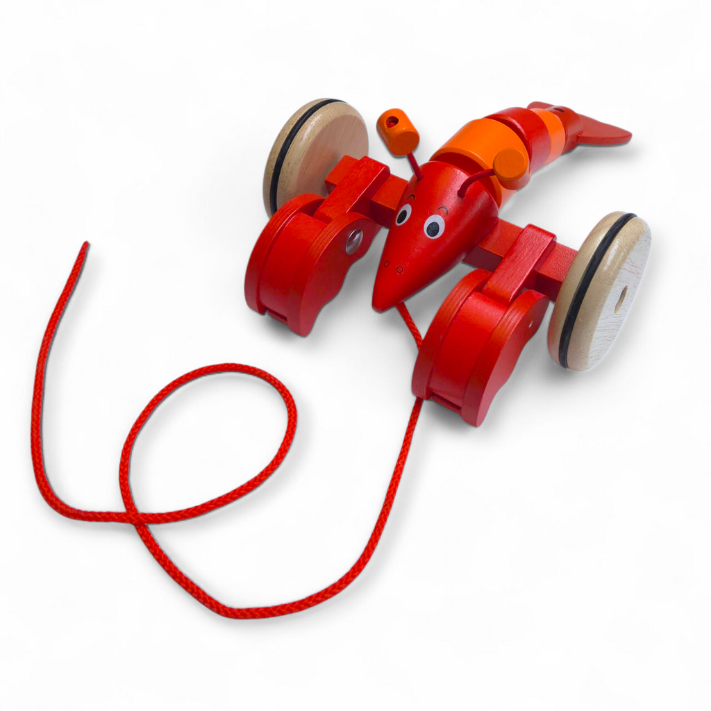 De trekkreeft klettert vrolijk met zijn scharen terwijl hij de kinderen volgt. Met een laagje rubber op de wielen om stiller over de vloer te rijden.
