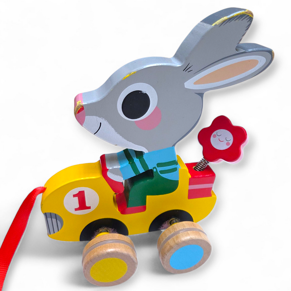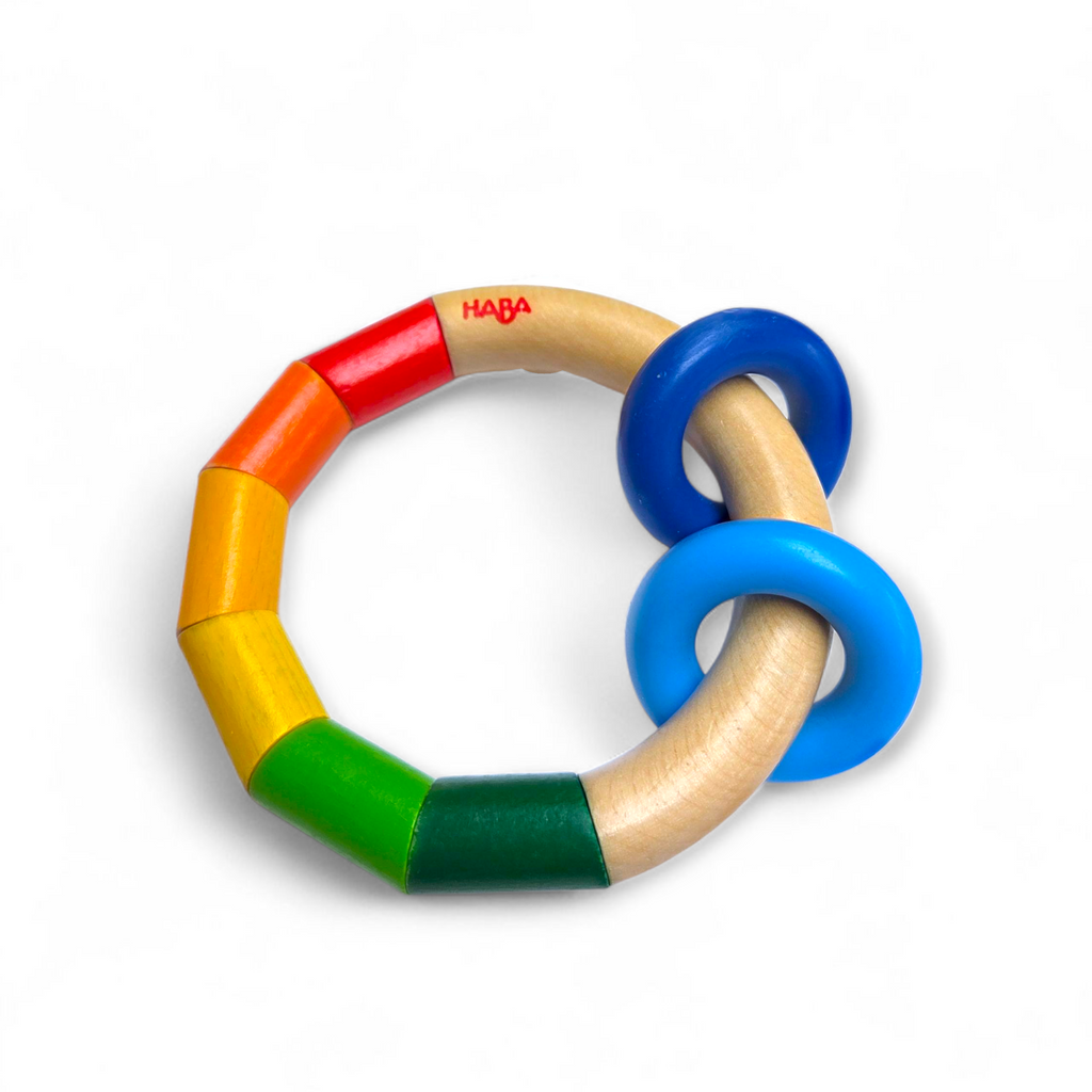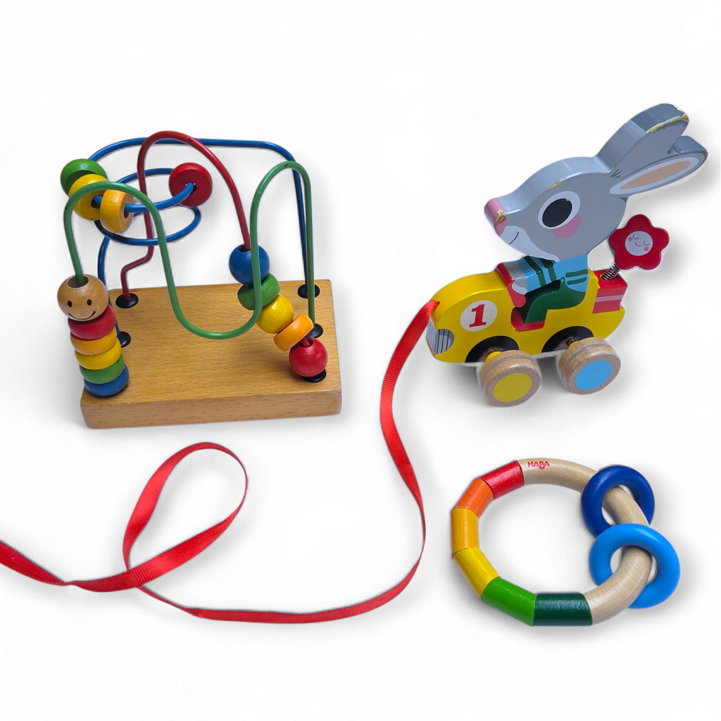 Set van 3 houten speelgoedjes, trekfiguur van Djeco, speelring van Haba.