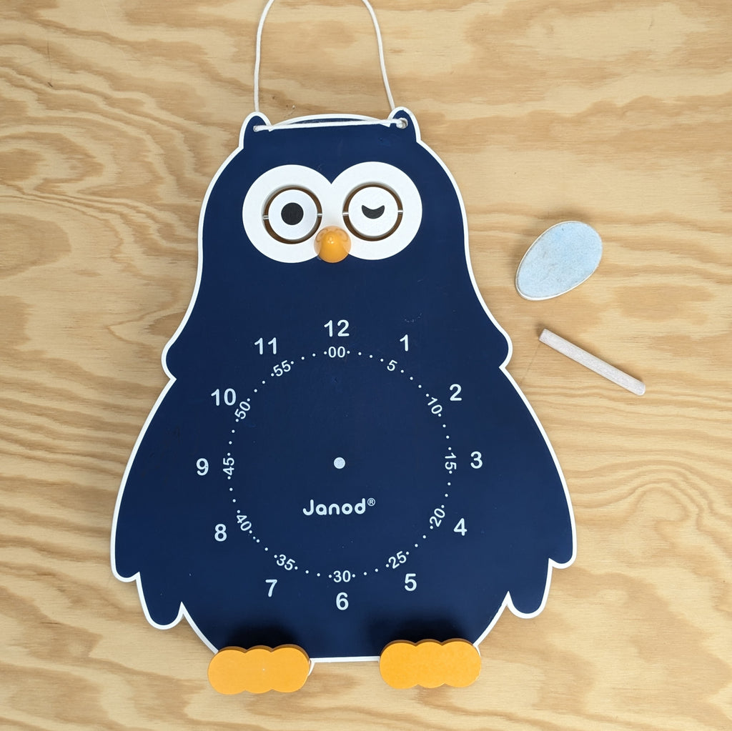 Om te leren kloklezen en zelf spelenderwijs de wijzers juist te leren zetten. De donkere kant is bedoeld om met krijt op te schrijven (inclusief wisser).