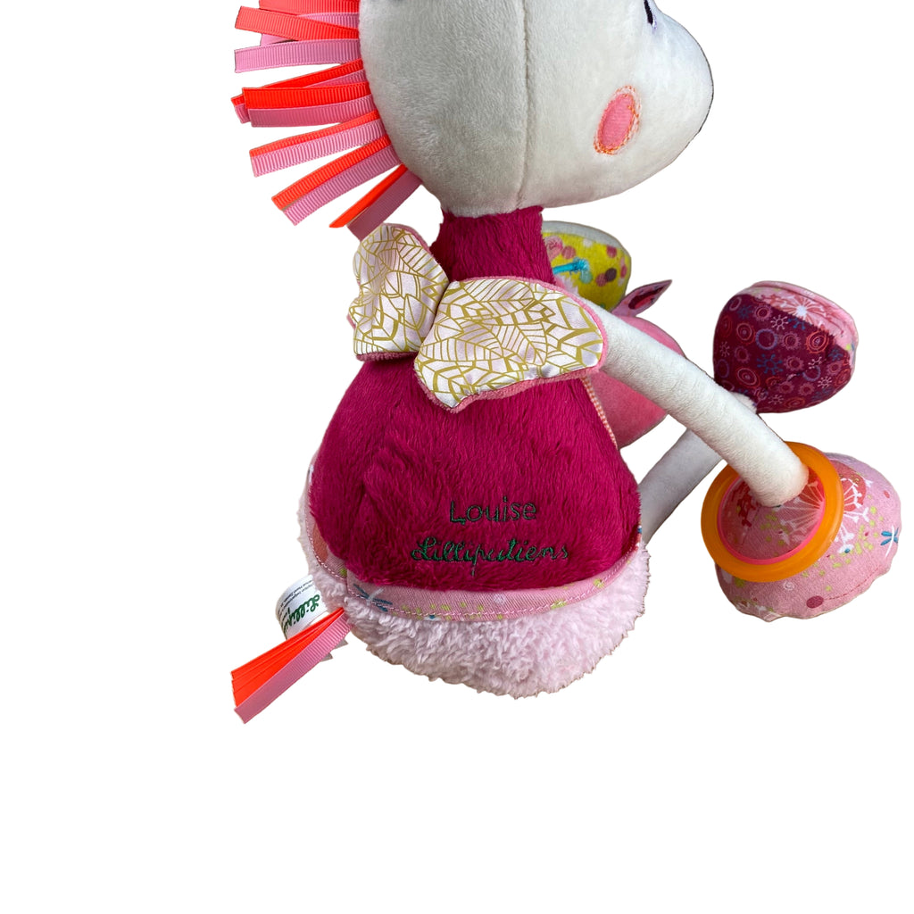 De verschillende materialen en texturen voelen zeer interessant aan in de kleine handjes. Friemelgeluidjes en een spiegel onder aan het voetje maken van deze een super leuke speelknuffel.